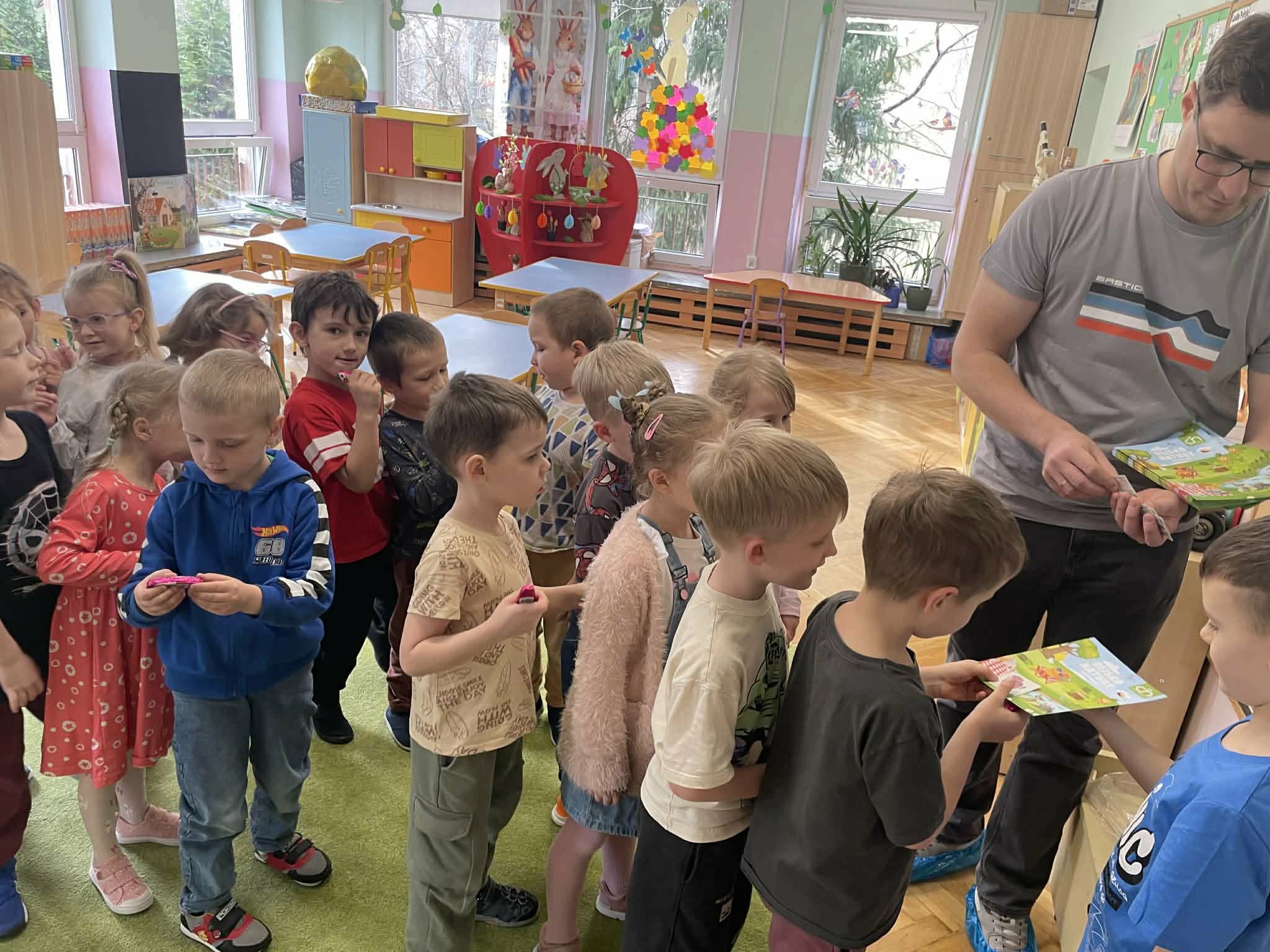 Dzieci z zaciekawieniem wysłuchały opowiadania czytanego przez rodzica. Następnie odpowiadaly na zadawane pytania i otrzymały kolorowankę wraz ze słodkim upominkiem od taty Kacpra. Podsumowaniem spotkania bylo narysowanie ilustracji do przeczytanej pozycji książkowej.