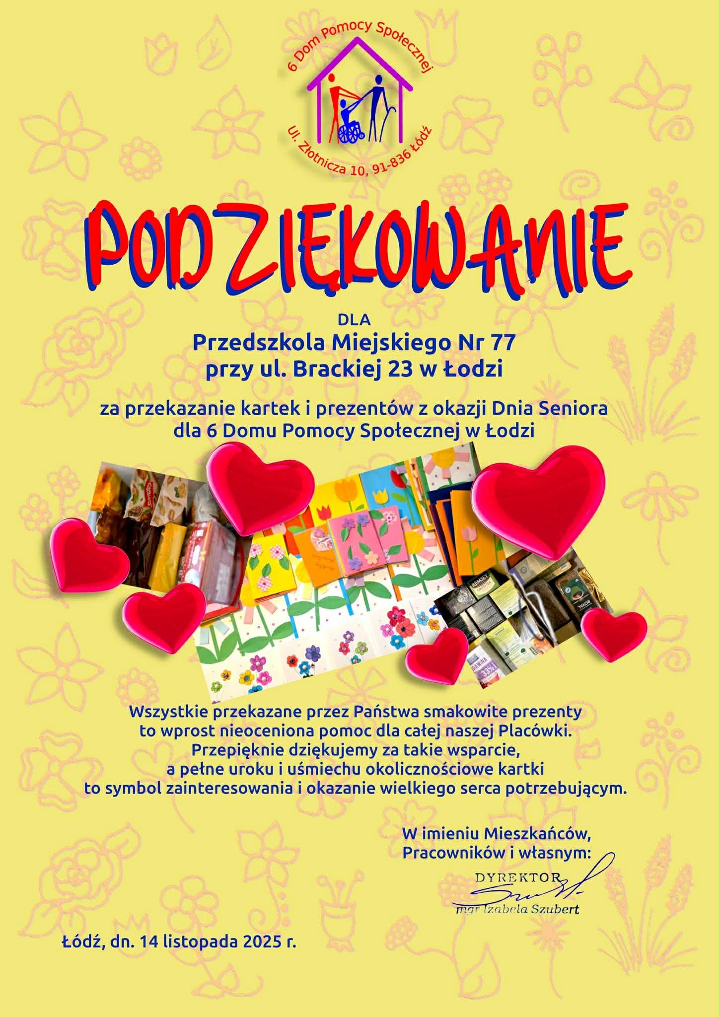 Z okazji Dnia Seniora przedszkolaki wraz z nauczycielami przygotowali kartki okolicznościowe dla Domu Pomocy Społecznej nr 6 w Łodzi. Rodzice i Nauczyciele przynieśli kawy, herbaty oraz słodki poczęstunek, aby uczcić ten szczególny dzień.