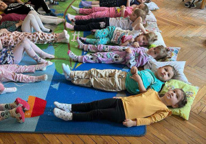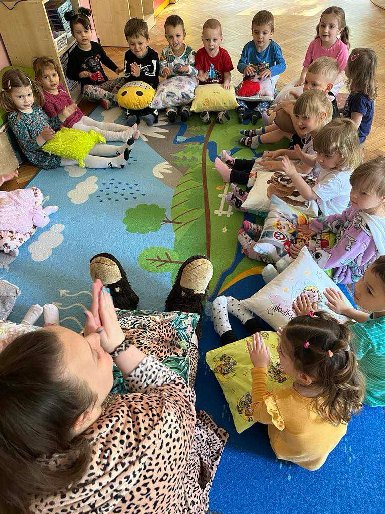 Warsztaty z pedagogiem specjalnym, w którym tematem przewodnim był odpoczynek, który ma ogromną rolę na nasze samopoczucie, zmniejszenie stresu, poprawę koncentracji i regenerację sił. Przedszkolaki na zajęciach były przeorane w wygodne piżamy i miały poduszki. Wszyscy byli zaangażowani i chętni do współpracy.