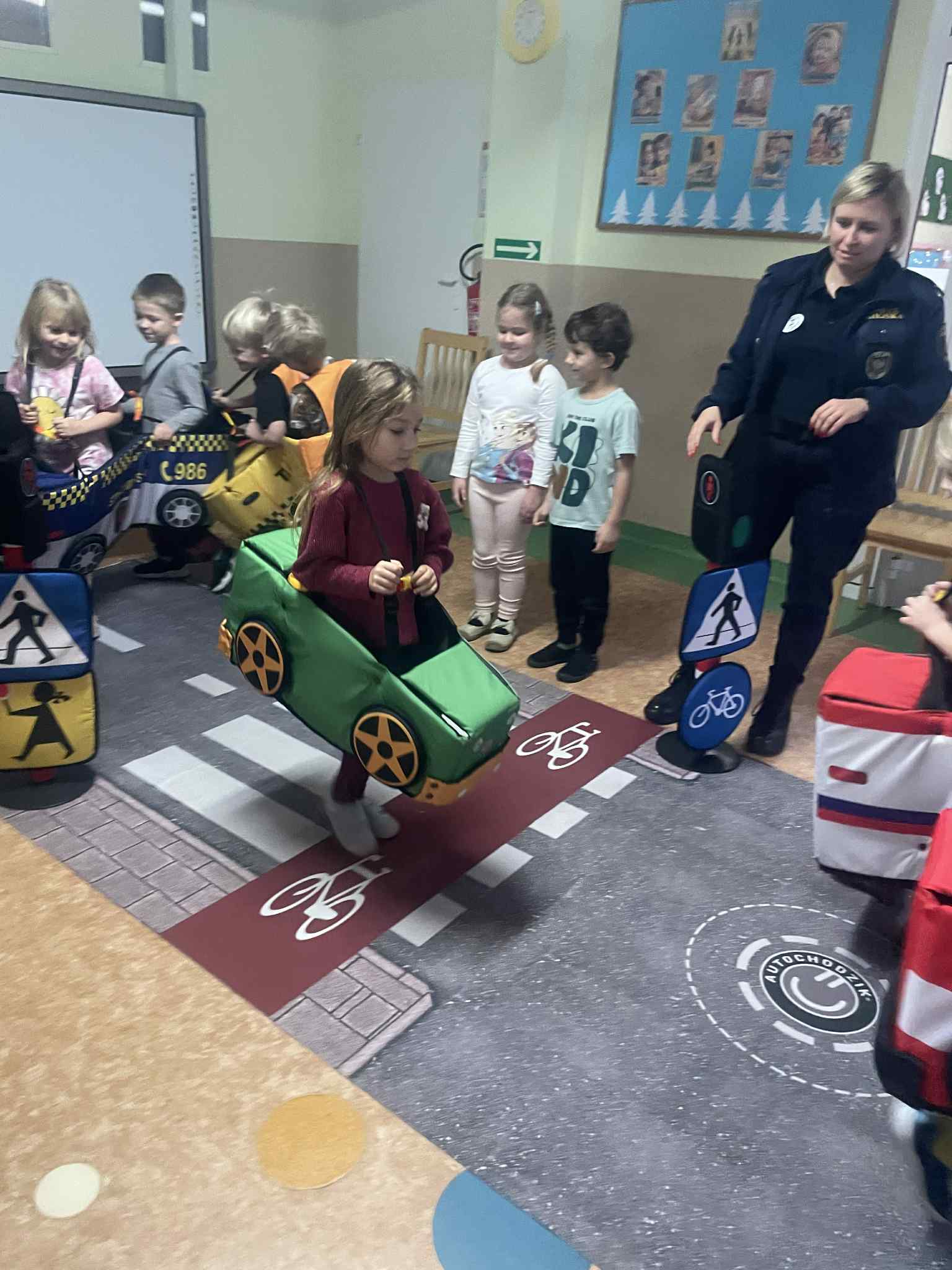 W drugiej części spotkania dzieci uczestniczyły w symulacji prawidłowego poruszania się po ulicy, chodniku i przede wszystkim przejściu dla pieszych.